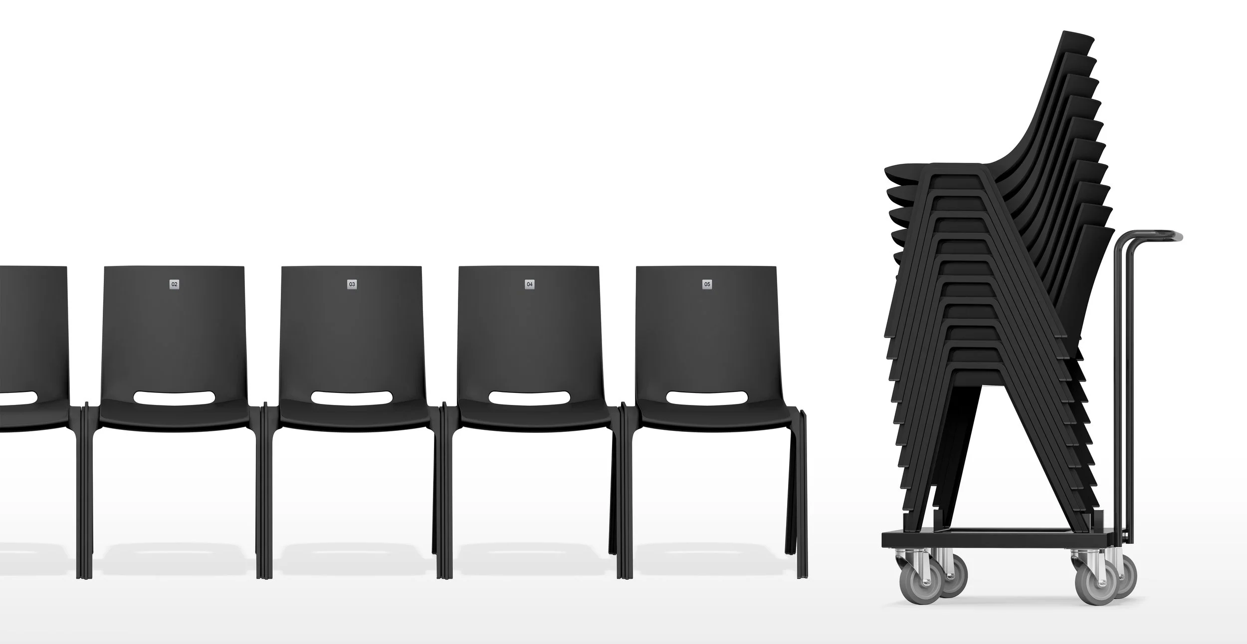 A one-piece cast which has been fitted with a system for linking and stacking. This is why the legs have been fitted with a unique system. CAS_CAS_2505/00_MONO is available in two versions. One has a plastic seat and another version has an upholstered seat. The chair is available in three colours. The seat, a separate plastic element, is available in the same three colours as the chair plus an three additional colours. This means you can achieve eighteen different colour combinations in plastic. One of CAS_CAS_2505/00_MONO's attractive characteristics is the way it can be quickly set-up and stored. This is why a clever transport method was developed which is available as an accessory. Another option is a unique numbering system which allows seats to be numbered digitally. This system is compatible with the CAS_CAS_2505/00_MONO.